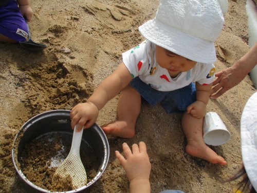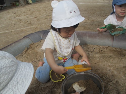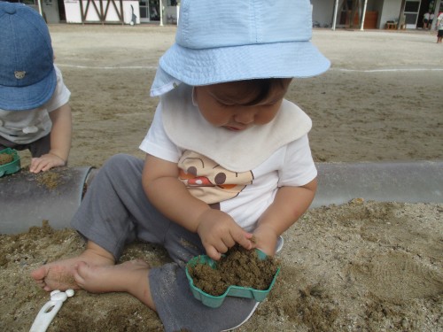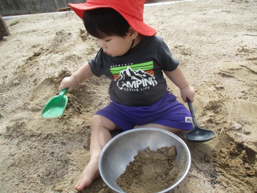 小さな入れ物に砂を詰めることが上手にできるようになったね!すごい!