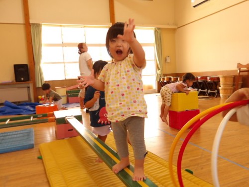 細い平均台もかかんにのぼる子どもたち、嬉しそうに手を振っています。