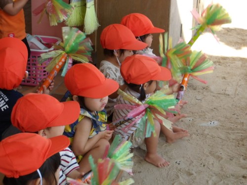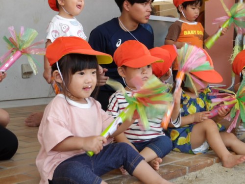 応援では一人ひとり種具を作りました。ラップの芯にシールを貼って子どもたちの前身のエイえいおー!のポーズをした写真を貼っています。また持ち帰るので見てください☆