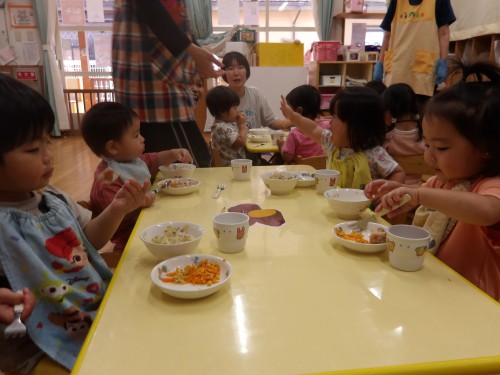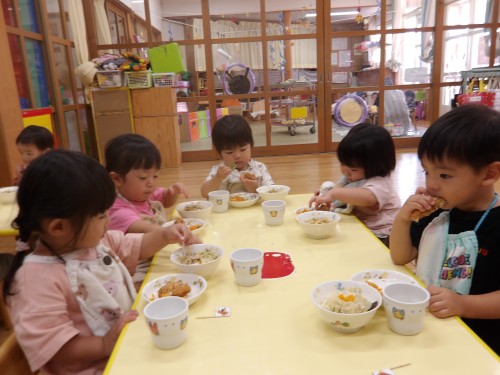 明日はいよいよ運動会☆彡毎日元気いっぱい身体を動かして遊んできました。ジャンプや登る降りる、回る、乗る、わたる、くぐる、倒すなど子どもたちは実際に遊具をつかって遊ぶ中で、身体の使い方、動かし方を習得していき、色々な場所で遊びを楽しんできました。子どもたちには毎日、身体をたくさん動かすためには、早く寝て、早く起きて、たくさん食べて元気パワーになるんだよ!っと伝えてきました。今日は給食の先生が運動会頑張ろうメニューを作っていただき、子どもたちも「おいしー」「いっぱいたべたよ」「もりもり」「明日運動会頑張る」など子どもたちから元気いっぱいの声が聴かれました!