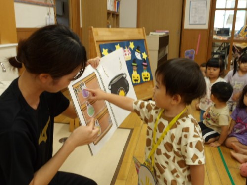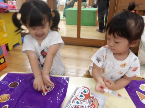 好きなキャラクターやおやつを選んで次々に手に取り貼るこどもや、アイスクリームが好きでアイスいっぱいのまんとにするこどももいましたよ!どれもかわいらしいこどもたちらしいマントが完成しました★またハロウィンが終わってから家庭に持ち帰ります。楽しみにしていてください。