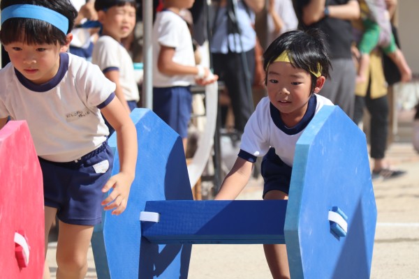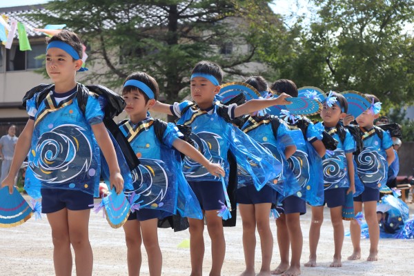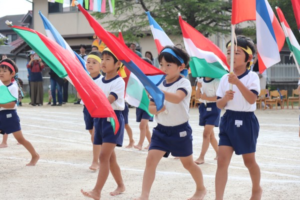ふくろう組とはと組がかっこいいパフォーマンスで運動会が始まりました。はと組は初めての旗にも挑戦し、ふくろう組さんと一緒に出来ることに嬉しさを感じていました。