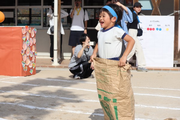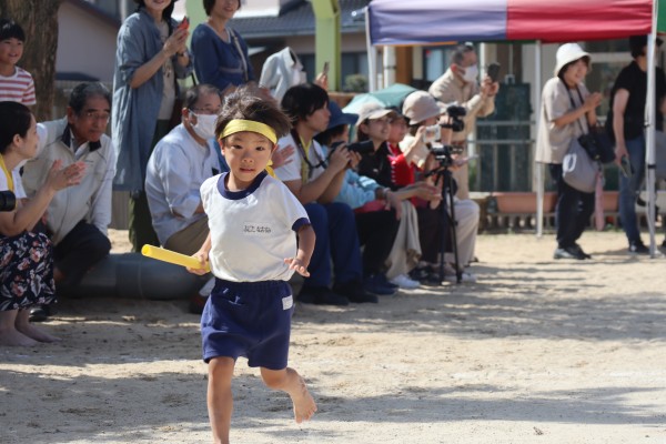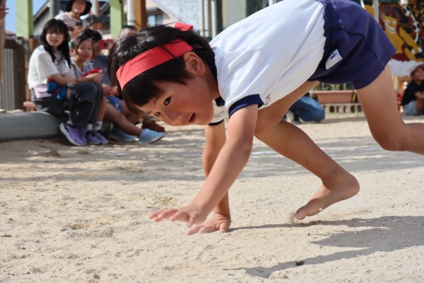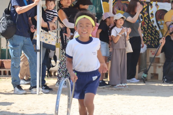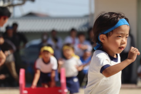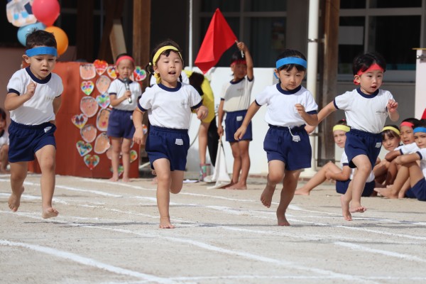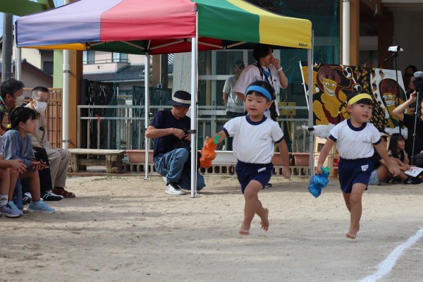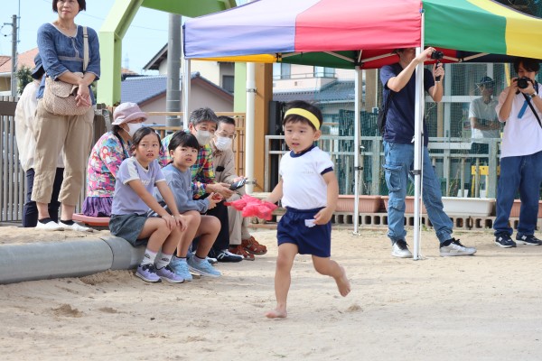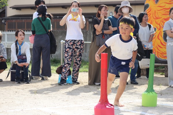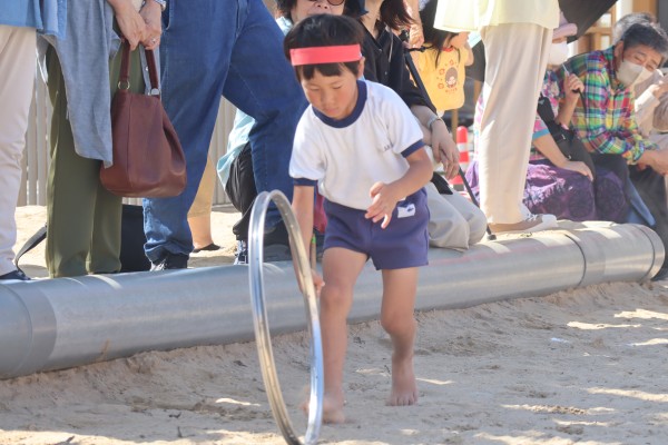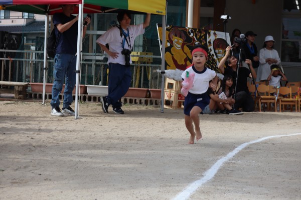 最初はかけっこです。みんな1位を目指してがんばりました。はと組、ふくろう組はタイムも計ります。