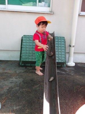 最近では動くものに興味を持つ子が増え、室内でおもちゃの車を斜面から走らせてみたり、水や松ぼっくりを樋に落として転がったり流れたりする様子を見て楽しむ姿が見られるようになってきました!