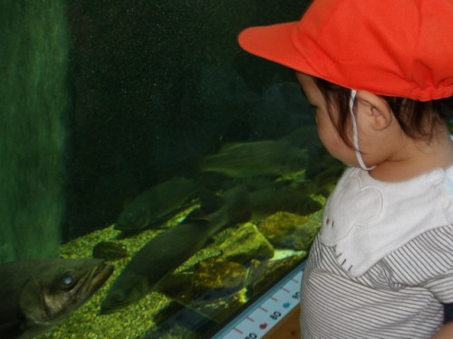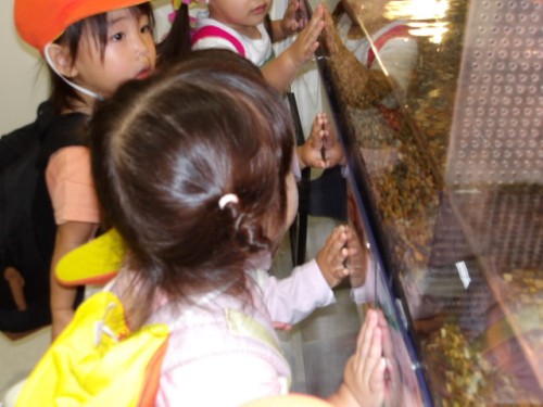 子どもたちの目の先にはいろいろな動きをする生き物たちが・・・・「おおきいね」「ちいさいね」「かめ」「カエル」「ちょきんちょきん」子どもたちは目に見たことを言葉にし保育者に伝えていました。