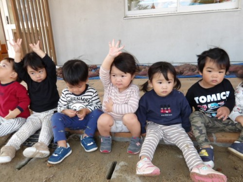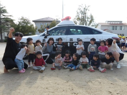 今日は交通安全で斐川交番からお巡りさんがパトカーに乗ってきてくださいました。近くでパトカーを見たり、お巡りさんに抱っこしてもらったりと貴重な体験をさせてもらいました。パトカーのライトを見て「あかー」「きらきら」「光ってる」「かっこいい」など子どもたちも嬉しそうに見つめていました。