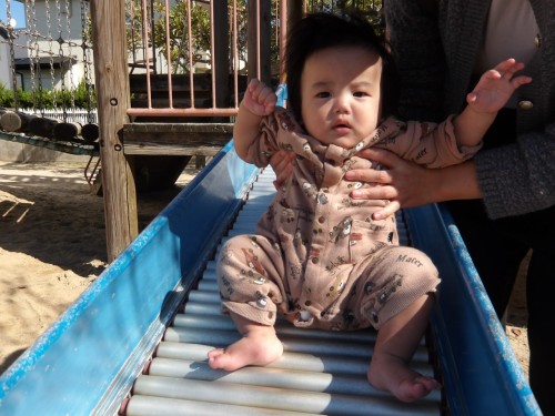 初めての滑り台👀ちょっと怖かったけどお母さんに支えてもらって挑戦してみたね✨