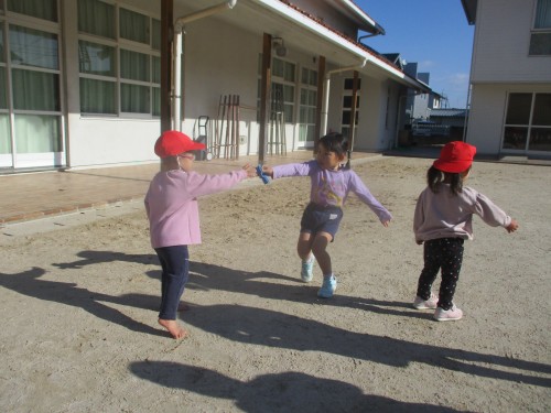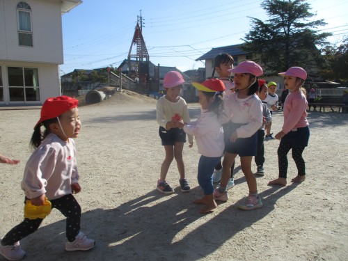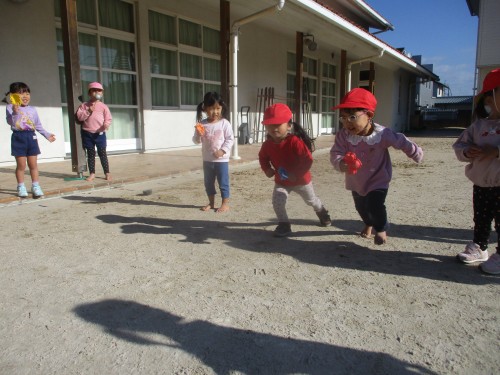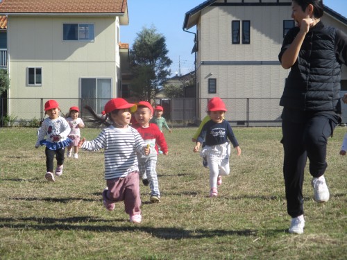 園庭ではお姉さんたちと一緒にリレーをして