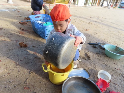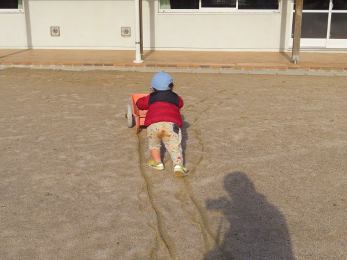 園庭ではごちそうを作って先生にくれたり、トロッコで道路ができたね!