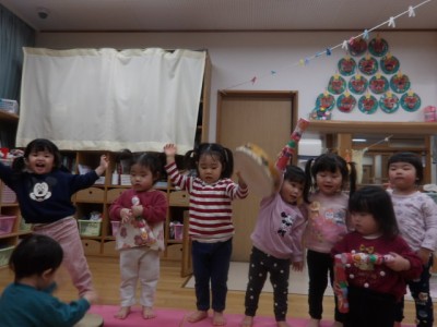 お部屋に帰ると、楽器を鳴らしたり歌を歌って踊ったりして楽しむりす組さんでした!