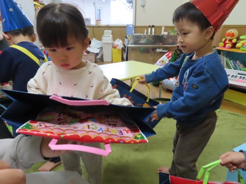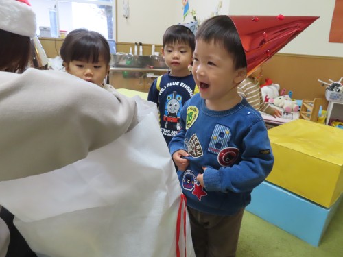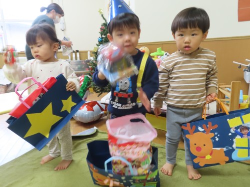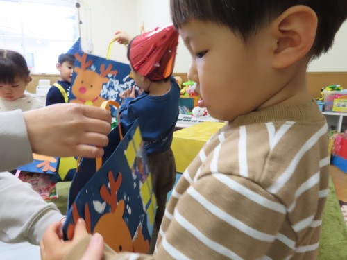 お部屋でクリスマスの絵本を見ていると「メリークリスマス~」サンタクロースがプレゼントを届けに来てくれました