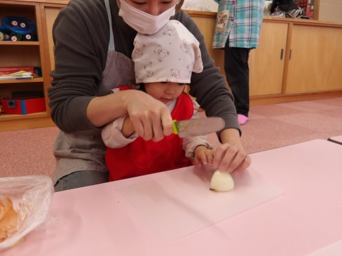 玉ねぎの皮を剥いて、お家の方と一緒に切ったり、