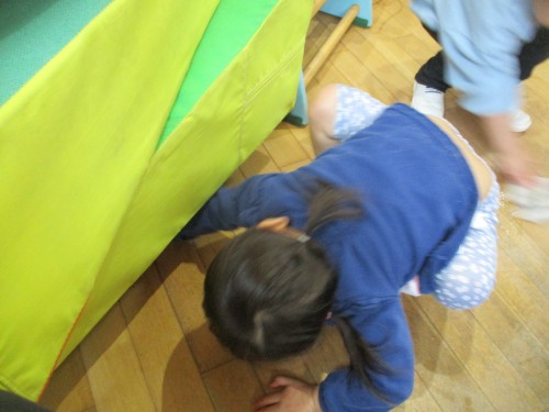 保育園玄関の棚の下まで手を伸ばして