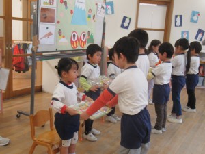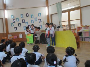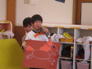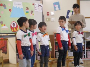 5人の1月生まれのお友だちがふくろう組の司会にインタビューとプレゼントを渡してもらったよ😊