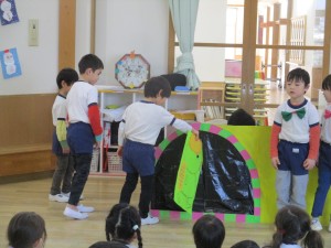 お楽しみはふくろう組司会の人と一緒にへんしんトンネルをしました!