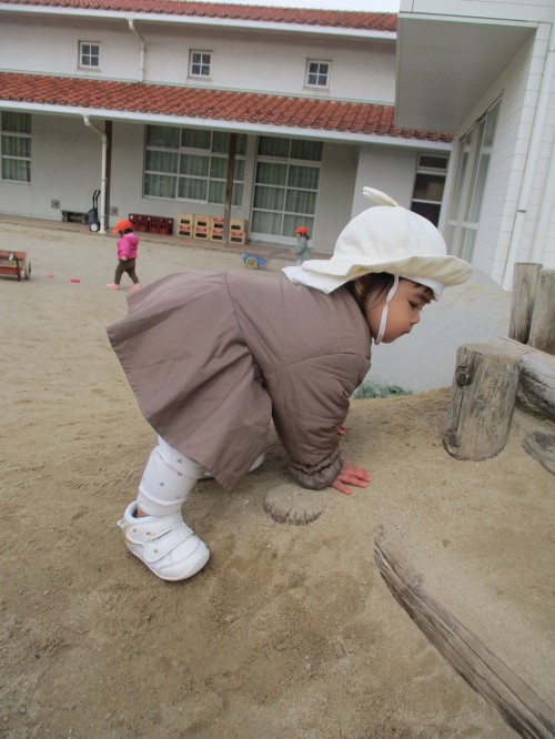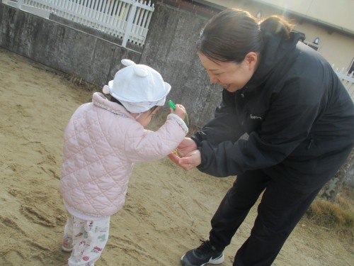 スコップに乗せた砂を大事に運んで先生に、、、「はい、どうぞ」としていました💓