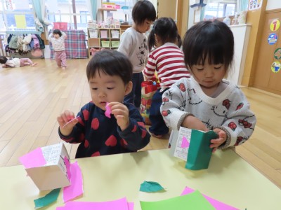 節分会の時にやってくる鬼に投げるボールの升づくりをしました!