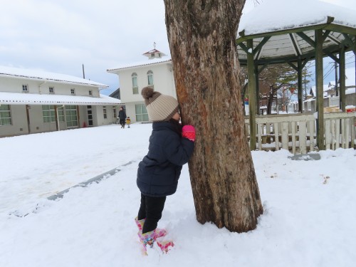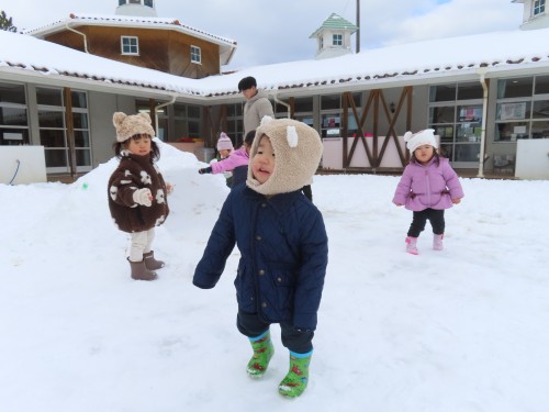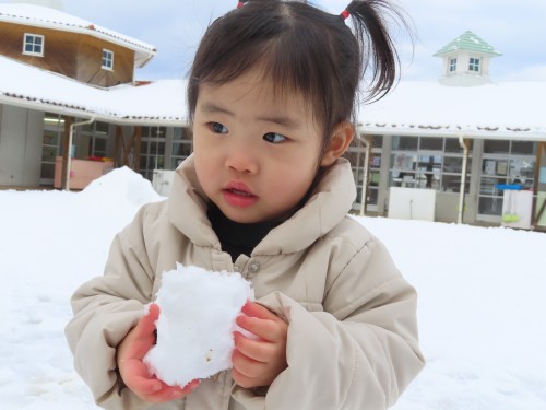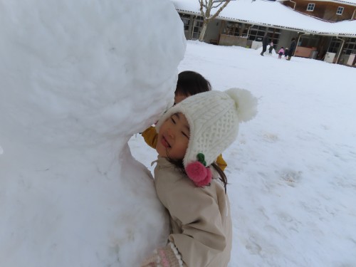 雪遊びに出るとお兄さんお姉さんが作っていた雪だるまとかまくらが・・・・子どもたちもおもいおもに遊ぶ姿が見られました。冷たい雪に触れると「さむーい」「つめたい」大きい雪ダルマをみて「おきいね、このひと」「ゆきいっぱい」などたくさん言葉も出ていましたよ!