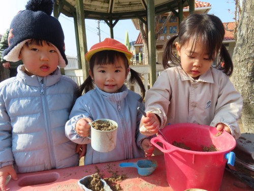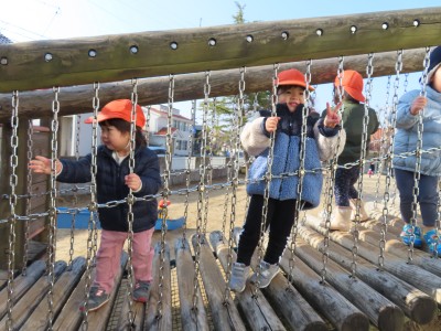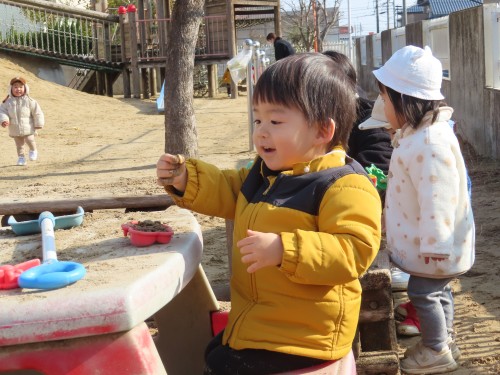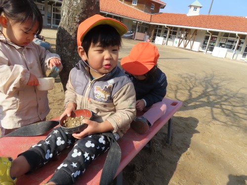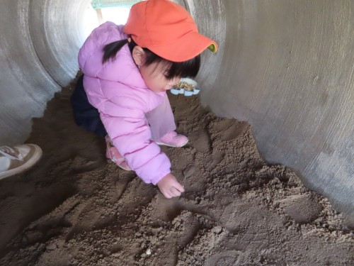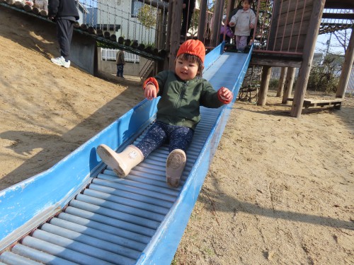 今日はとても天気が良く子どもたちも元気に外遊びをしていました。滑り台を滑ったり、ままごとをしたりかけっこや豆拾いをして身体をたくさん使って遊んでいます!