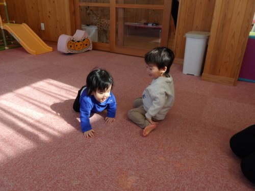 えがおハウスのお友だちは赤ちゃんが来たら近づいていき、よしよしと優しく頭をなでてあげる姿が