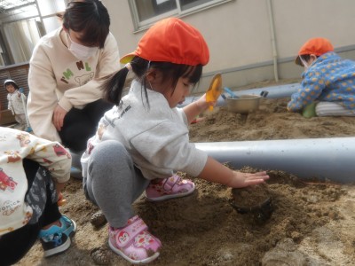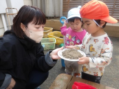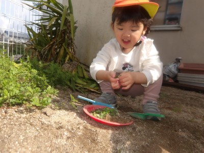 温かくなってきて緑が増えてきた中庭では植物を集めてままごとに使う姿もあります🌱