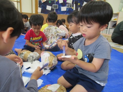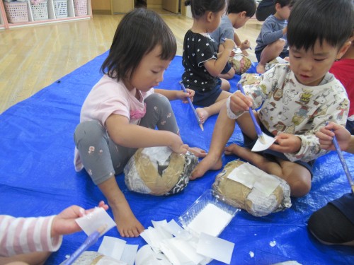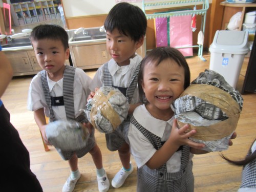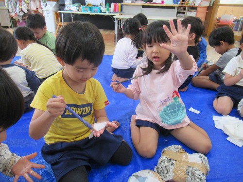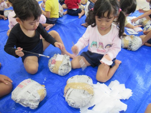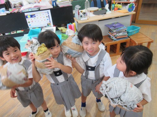 考えながら新聞紙を丸めて作りました。「顔には色があるね」と子どもたち。