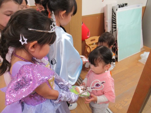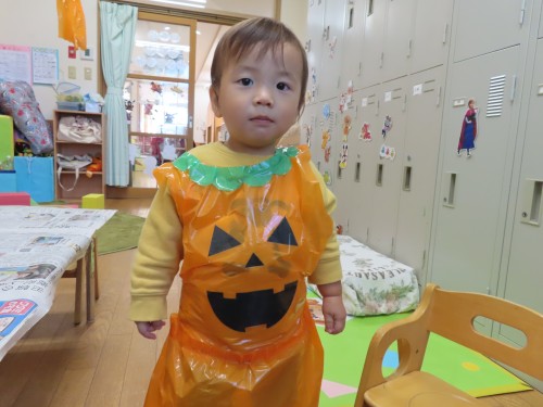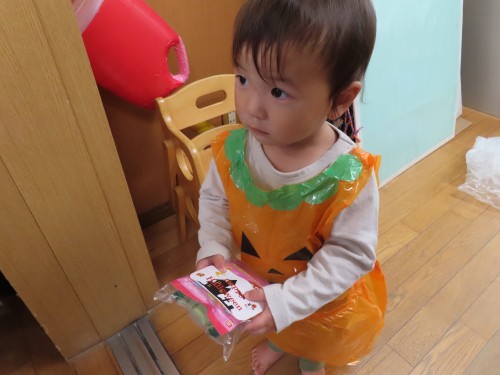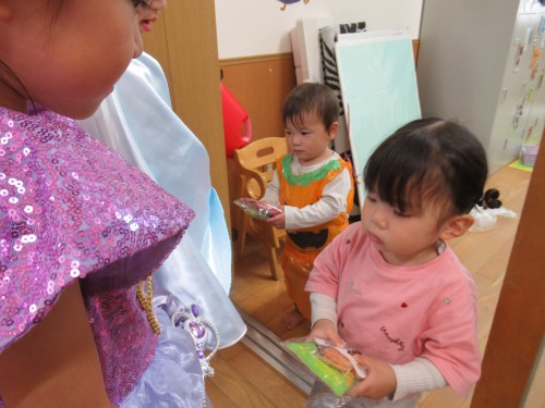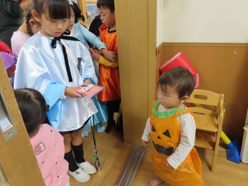 お部屋で遊んでいると仮装したふくろう組のお兄さんお姉さんたちがハロウィンのお菓子を持ってかもめ組さんに来てくれました✨