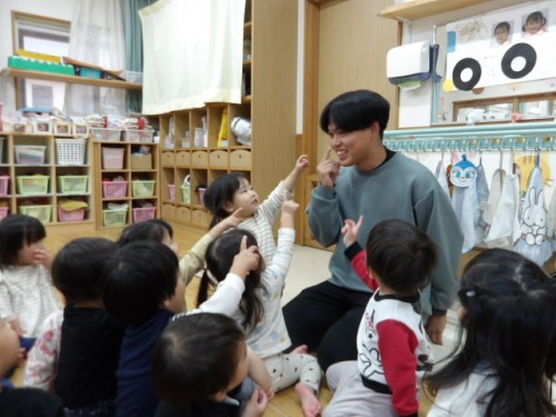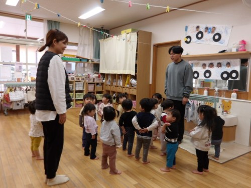 今日は「○○先生の目はどこだ」「鼻は?」「口は?」など簡単なクイズで子どもたちの視線をくぎずけに!!