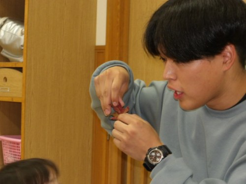 季節の歌は「どんぐりころころ」「まつぼっくり」「とんぼ」「しょうじょうじのたぬきばやし」「大きな栗の木の下で」「あさのうた」をりす組では歌っています。4月に比べると歌う声も増えたり、身振り手振りで歌をみんなで楽しんでいます。