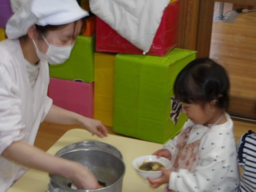 先日おたよりでも書かせてもらった給食の時間の配膳☆彡時bンのお変わりがしたいものの皿を配膳台に持っていき今日は給食の先生に入れてもらいました。いつも作ってもらっている先生に直接ありがとうや「おいしい」などこどもたちから伝えていましたよ。