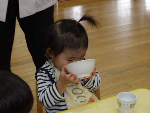 また食べるときはお皿を持って食べれる子どもも増えてきました。お皿を持って食べることでより料理の香り味、食材を近くで感じることができますね。