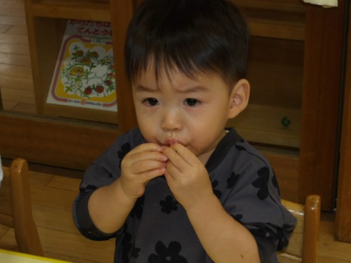 がんばって食べた後は、果物です。食べる量も増えてきました。好き嫌いも出てきたり田部村もあるとは思いますが、みんな給食もしっかりたべていますよ。