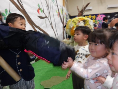 こういった場では異年齢の交流も見られます、大きいお兄さんお姉さんは小さい子どもたちにとてもやさしくしています。してもらったことは子どもたちの宝物になり、次はりす組の子どもたちが大きくなり小さい友達に同じ優しさを分けてあげるようになります。